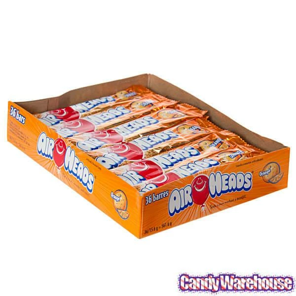 Display box contains 36 Orange AirHeads Taffy Candy Bars, each with a net weight of 0.55 ounce.
