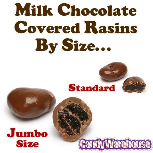 The math is simple. The delectability is not. Try a taste of these rich, creamy, plump, and chewy chocolate covered raisins and see just how great jumbo can be!