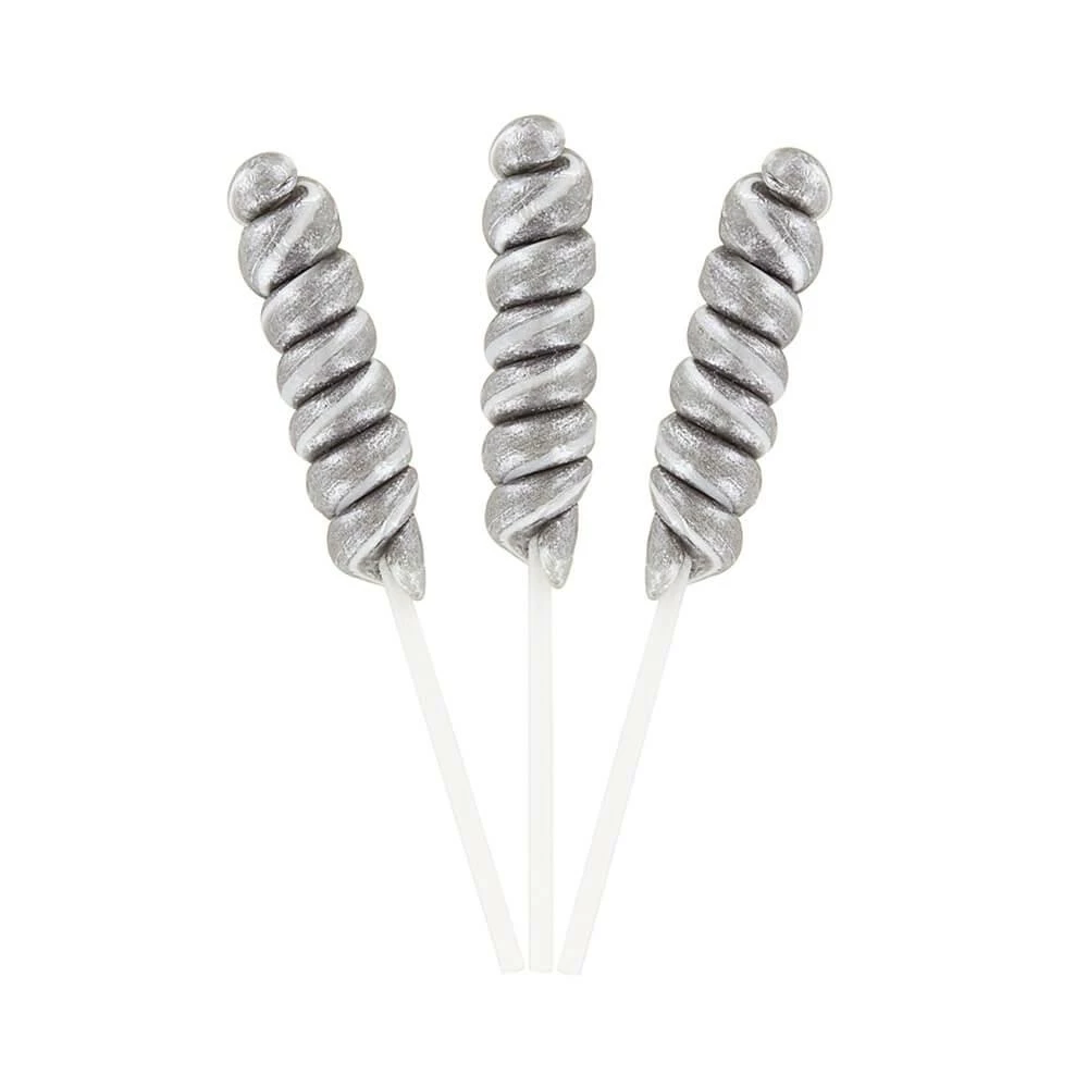 Featuring a shimmering silver candy color and a fabulous blackberry flavor, each of these tiny Silver Twist Lollipops is sure to surprise and delight with every bite! Hosting a 25th anniversary celebration or other party with a silver color theme? These tasty pops are perfect for dessert tables and candy buffets at such events. Wow you guests with color-coordinated candies!