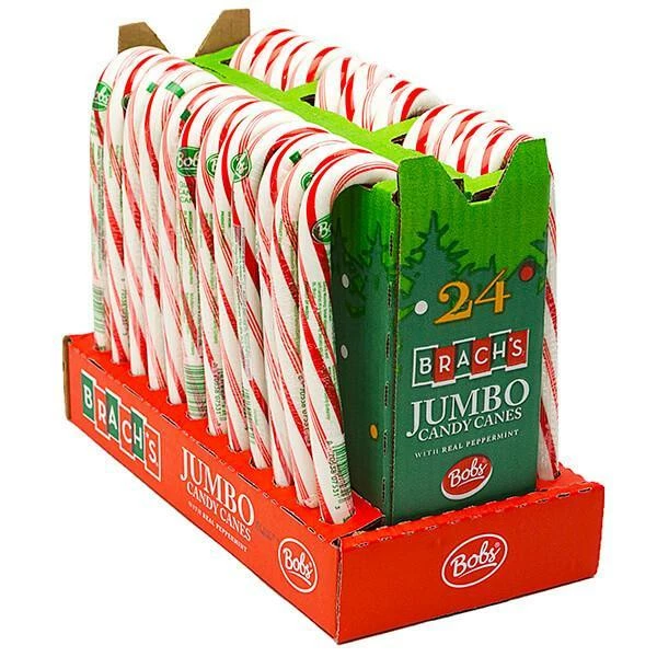 Display box contains 24 wrapped Brach’s Bob’s Peppermint Giant Candy Canes.
