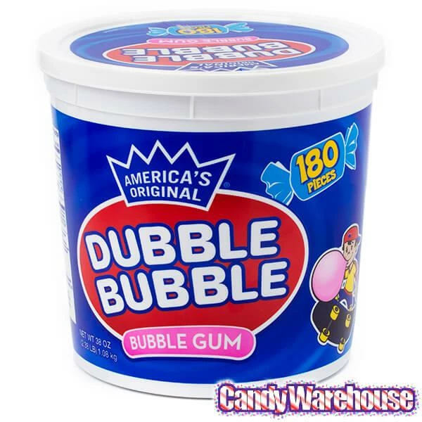 Tub contains 180 twist wrapped pieces of Dubble Bubble Bubblegum.