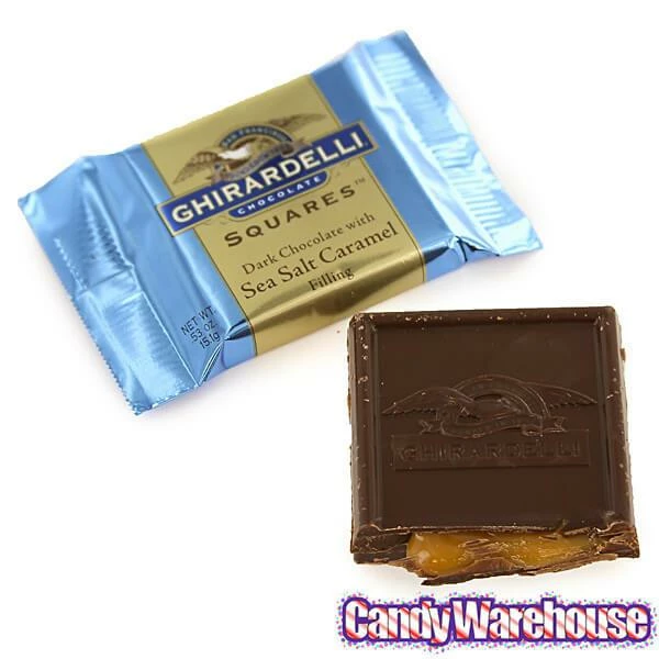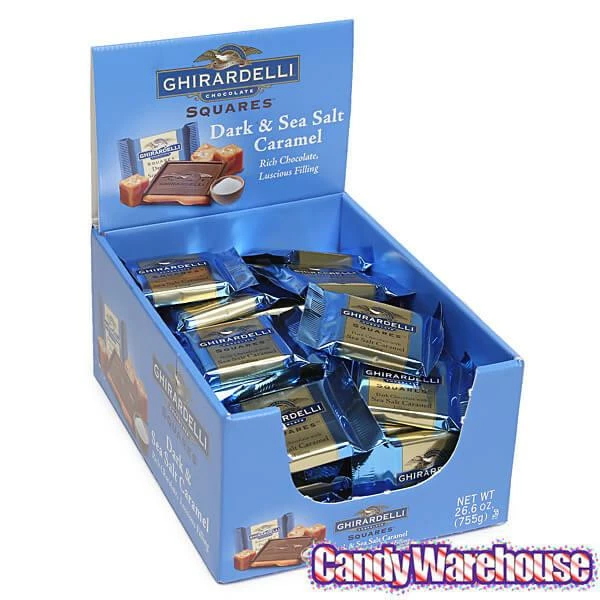 Display box contains 50 wrapped Ghirardelli Dark Chocolate with Sea Salt Caramel Filling Squares.