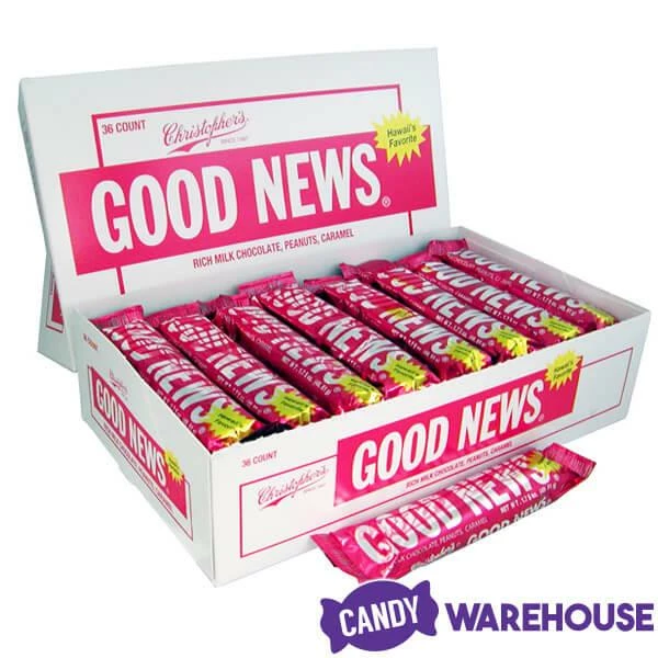 Display box contains 36 Good News Candy Bars, each with a net weight of 1.75 ounces.