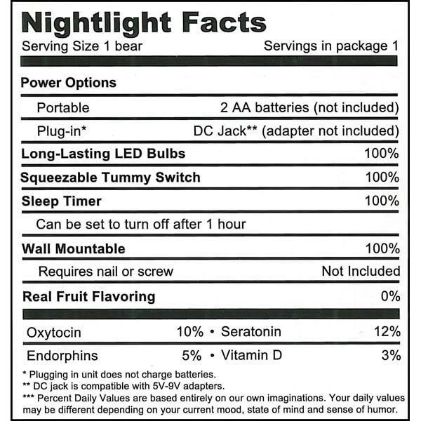 This nightlight is powered by two AA batteries (not included). You can set the light to either switch off after one hour, or to stay on indefinitely, manually turning it off at any hour of your choosing by simply squeezing the belly again. The nightlight is both wall mountable and capable of sitting upright on a hard surface, so it fits in anywhere. Sweet dreams!