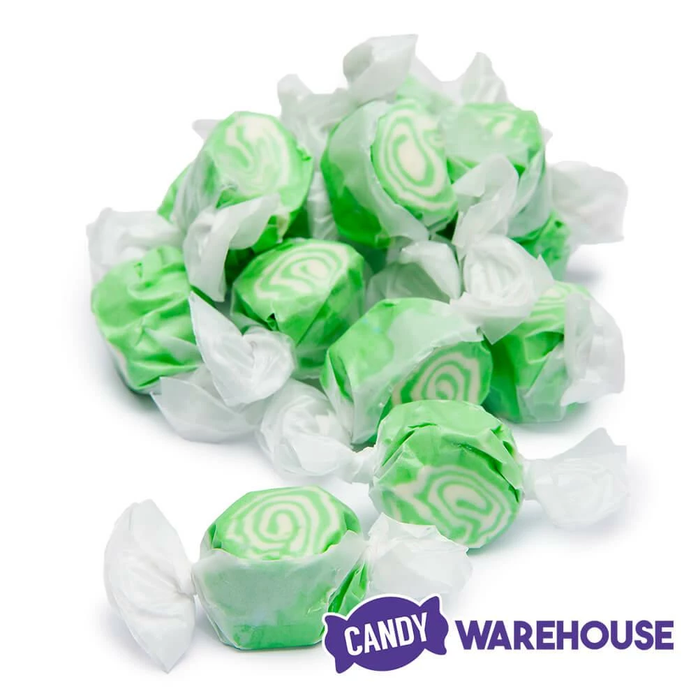 Bag contains 3 pounds of Green Swirled Key Lime Salt Water Taffy.