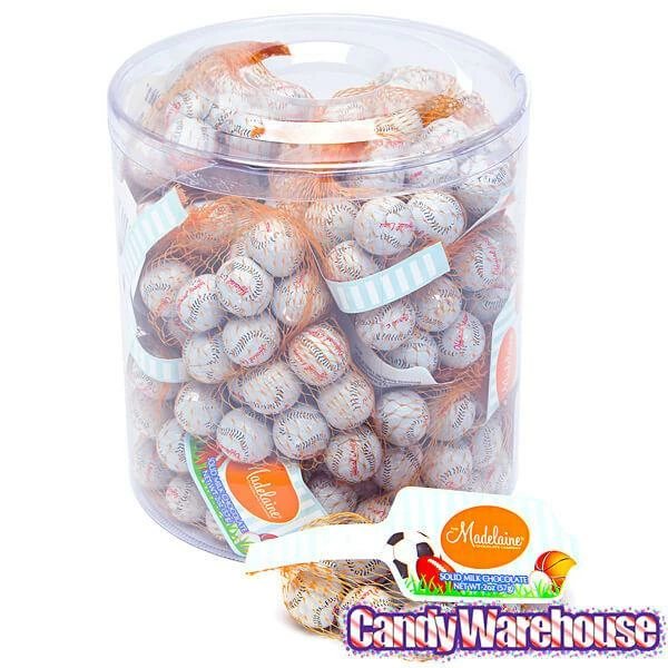 Acetate tub contains 24 Foiled Milk Chocolate Baseballs Mesh Bags, each with a net weight of 2 ounces.
