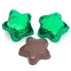Decadent milk chocolate stars wrapped in metallic foils of bright green!