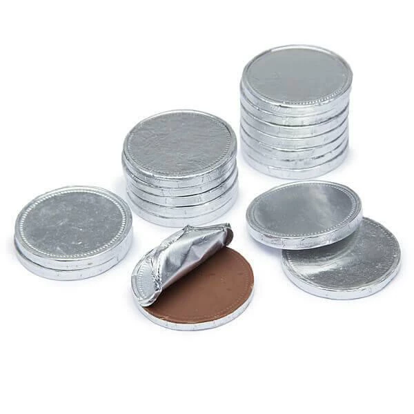 Bag contains 5 pounds of Silver Foil Wrapped Milk Chocolate Coins Candy.