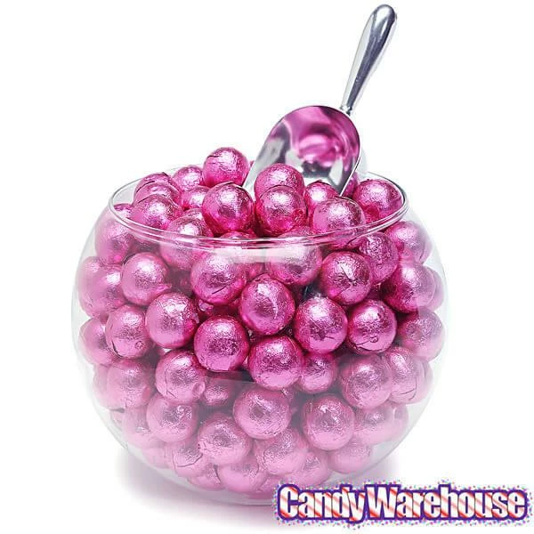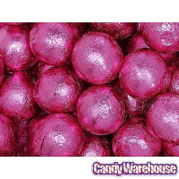 Bag contains 5 pounds of Bright Pink Foiled Caramel Filled Chocolate Candy Balls.