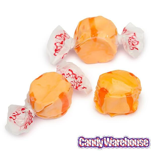 Bag contains 2.5 pounds of Gourmet Orange Salt Water Taffy Candy.