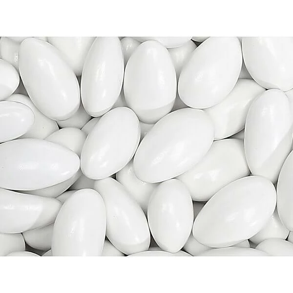 Bag contains 5 pounds Sconza White Jordan Almonds Candy.