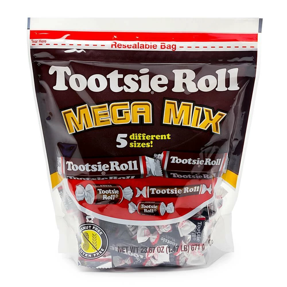 Resealable bag contains 23.67 ounces of Tootsie Rolls Mega Mix Bulk Candy Assortment.