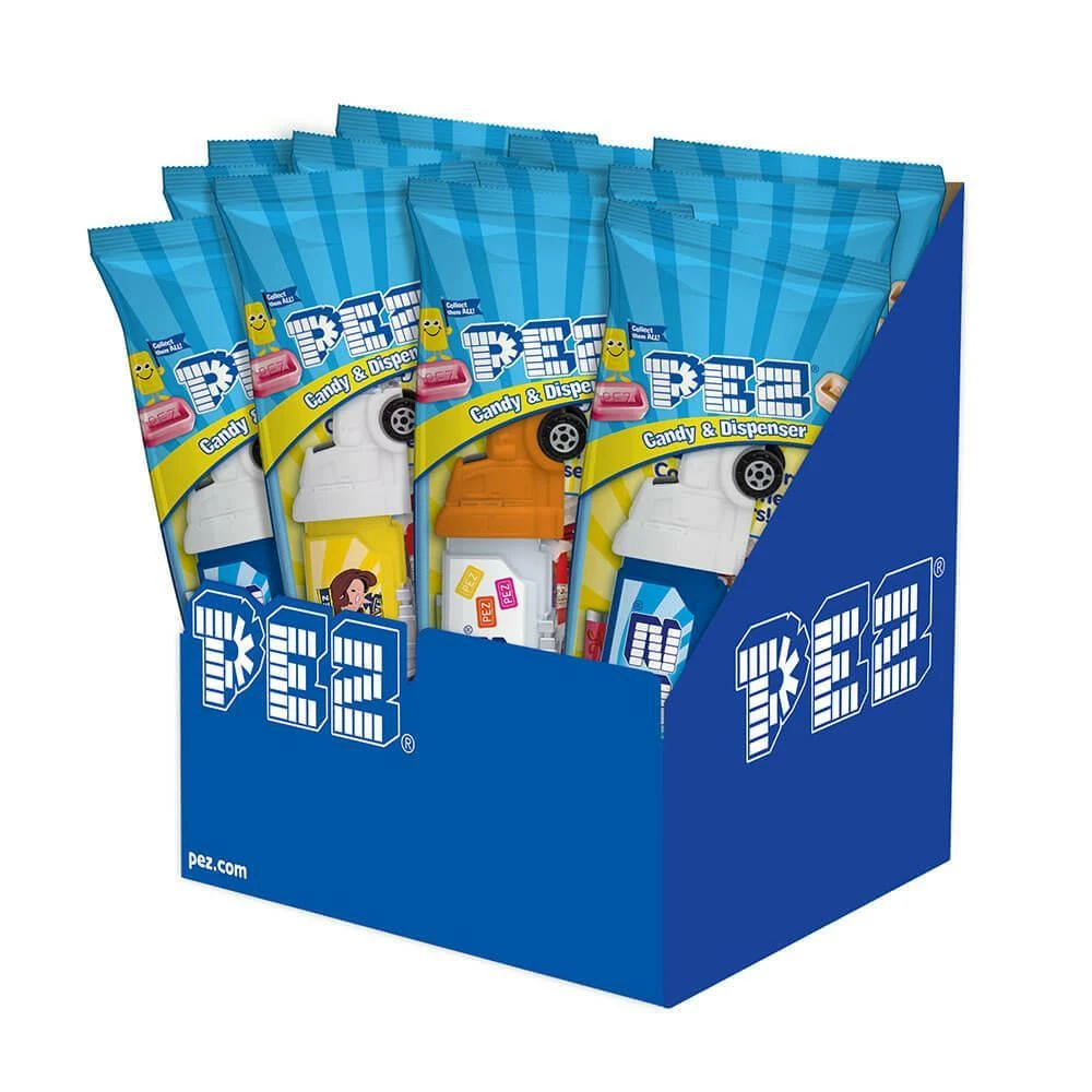 Display box includes 12 PEZ Big Rigs Packs, each containing 1 dispenser and 2 PEZ candy cartridges.